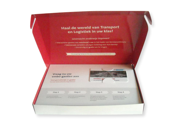 Met en voor Openlab hebben wij deze bedrukte verzenddoos van sulfaatkarton met een retourbox van golfkarton gemaakt. Daarnaast hebben wij een bedrukt mapje voor de codekaarten gemaakt. De retourbox is getest voor de verzending van medische producten met de post.