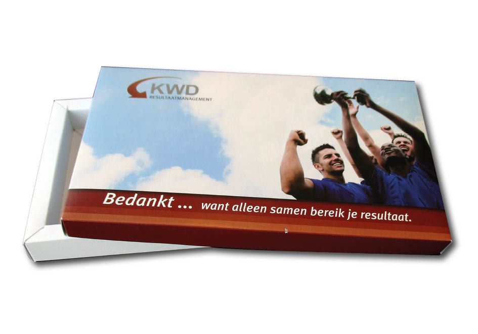 Een andere mogelijkheid is het maken van een mooie sleeve over een bestaande doos. Dat kan een dichte doos zijn, of een open doos met dikke rand, zoals op bijgaande afbeeldingen. De zending krijgt daarmee een heel andere aanblik. De sleeve wordt bedrukt en precies op maat gemaakt en geplakt door ons aangeleverd, zodat deze alleen nog over de doos geschoven hoeft te worden.