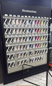Display wand met hangende doosjes Mjoy in euroloch haken