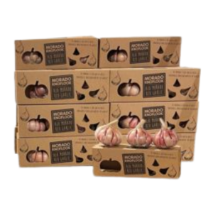 Voor de Spaanse Morado knoflook van Handelsonderneming C.J. den Boer hebben wij dit mooie kraft doosje op maat gemaakt. Er gaan 3 hele knoflook in het doosje. In het doosje zitten speciaal uitgesneden vensters in de vorm van knoflookteentjes en een gehele knoflook. De vensters zijn zonder folie. De opdruk is in zwart. Het karton is voedselveilig. Het formaat van het vensterdoosje met autolockbodem is 175 x 60 x 60 mm.