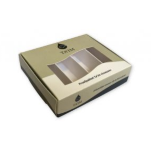 Voor Taim Vissaus uit Urk hebben wij dit bedrukte doosje met venster gemaakt. In het doosje gaan 4 sample flesjes van 20 ml met schol vissaus. Door de opstaande randjes tussen de glazen flesjes worden ze goed beschermd. Het vensterdoosje is een mooi voorbeeld van een proefpakket. Het venster heeft een golf vorm. Het in full color bedrukte doosje met venster is 106 X 92 X 26 mm en kan met de post opgestuurd worden.