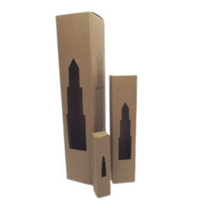 Deze doosjes hebben een speciaal venster in de vorm van de contouren van het gebouw. Door het venster kan je de kaars en zijn kleur zien. De doosjes zijn gemaakt van door en door bruin kraft karton en bedrukt in zwart. Het kraftkarton is biologisch afbreekbaar. Kijk voor de mooie kaarsen op de site van Kaarsen van Torens.