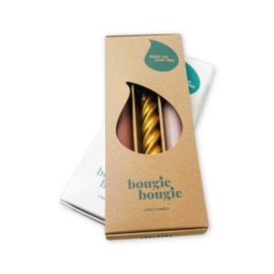 Voor de mooie diner candles van Bougiebougie hebben wij dit bedrukte doosje met venster gemaakt. Het venster heeft de vorm van een vlam. Het doosje is zowel in wit als in bruin kraftkarton gemaakt en bedrukt in groen met het logo van Bougiebougie. Door de opstaande randjes tussen de kaarsen beschadigen de kaarsen niet. Het doosje is 220 x 85 x 27 mm.