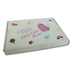 Dit bedrukte klepdoosje gemaakt van stevig golfkarton is speciaal op maat gemaakt voor een kado. De buitenzijde is in full color bedrukt met speelse opdruk met allerlei tekeningen. De maat is geschikt voor a5 formaat inhoud en is 222x152x70 mm