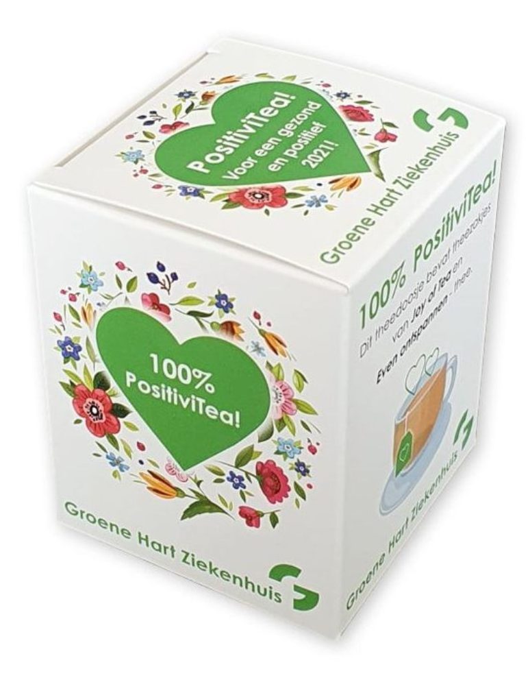 Deze full color bedrukte theedoos is speciaal ontworpen voor losse theezakjes en straalt 100% positiviTea uit. Voorzien van het logo van het Groene Hart Ziekenhuis, combineert dit stijlvolle doosje functionaliteit met een frisse, positieve uitstraling. Perfect om thee op een vrolijke en zorgzame manier uit te delen en te presenteren. Klik hier voor meer informatie.
